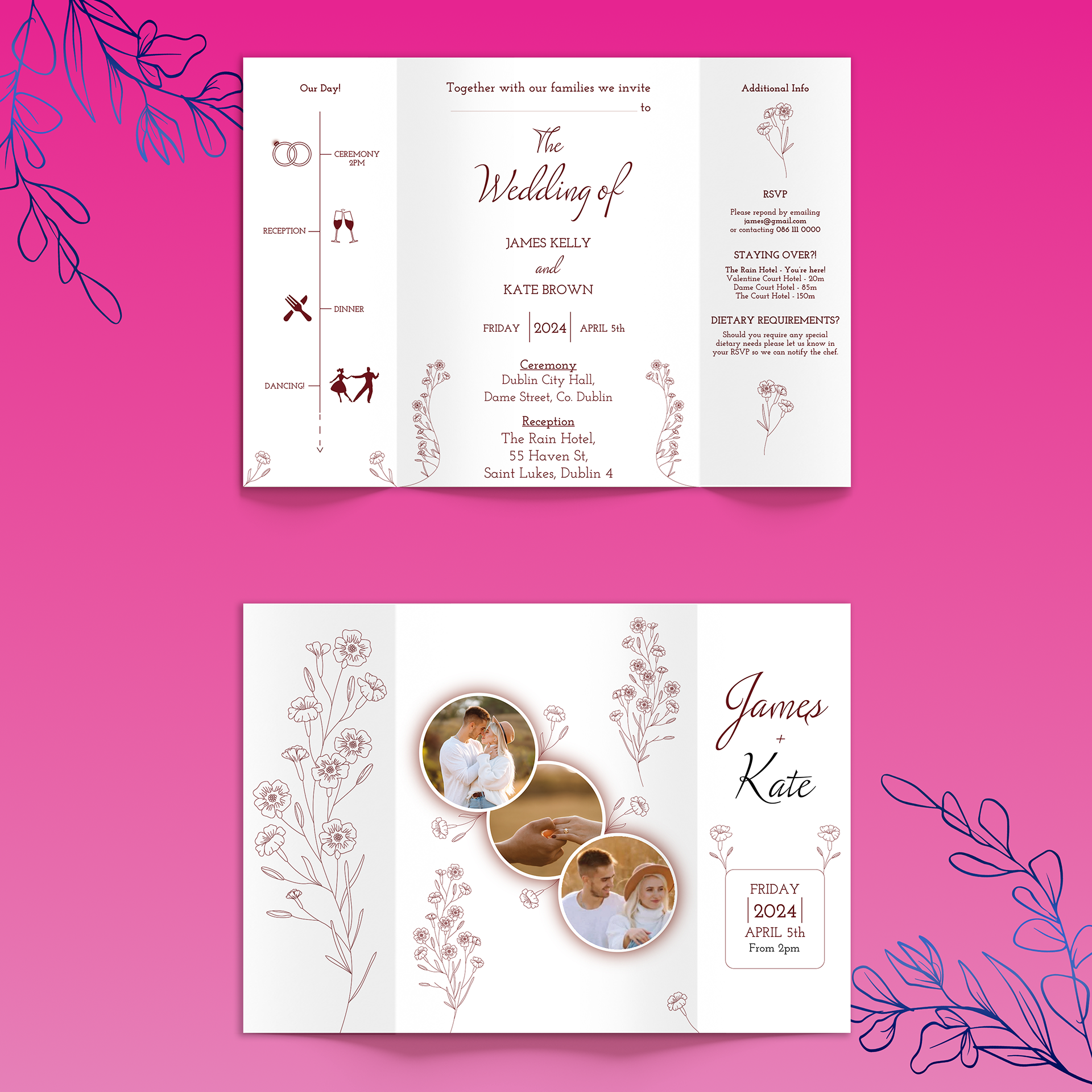 In 2024, I was asked to design wedding invitations for a friend of a friend. My design focused on achieving a functional piece that delivers on both balance and elegance. Each element was carefully chosen and placed so that the details were easily readable at a glance.